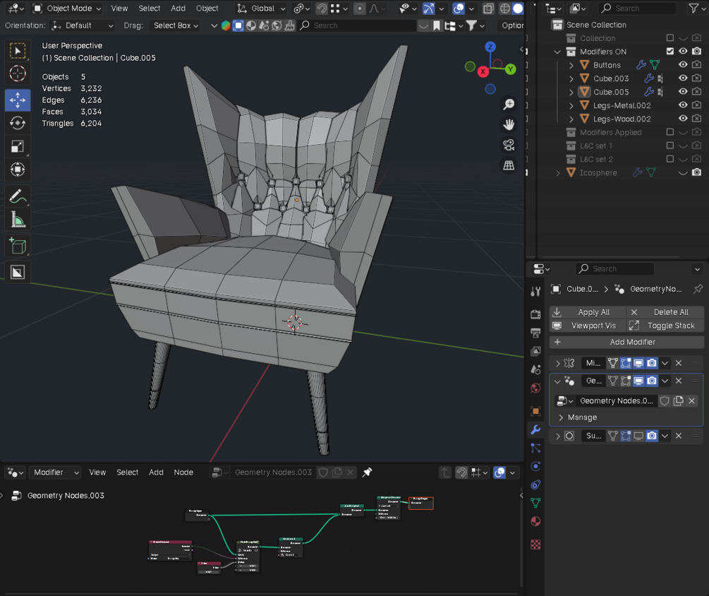 the second copy is ready to use where all the modifiers are applied. When you purchase it you will receive 3d model of the chair in .blend, .usdc, .obj and .fbx format. Without need for Blender software, you can directly import the chair to your scene. So you will able to use it not only in blender but also in your game engine software or Procreate.